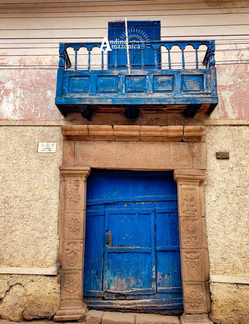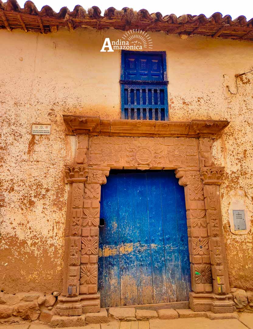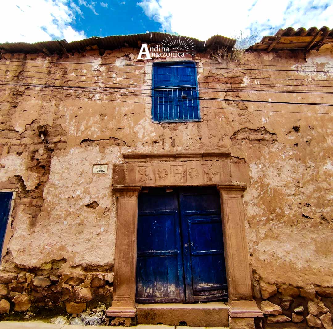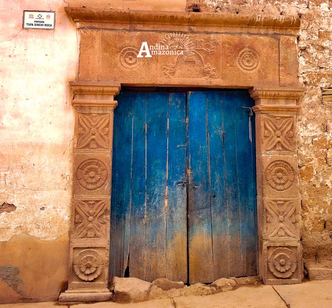 PORTADA TUPA SINCHI ROCA, esta portada es de gran importancia histórica, ya que le perteneció al “Inca Tupac Sinchi Roca”, a cuyo linaje pertenece el gran pintor Marasino “Antonio Sinchi Roca”, artista indígena que realizó su mayor producción artística a finales del S.XVII y comienzos del S. XVIII. el dintel representa un escudo de armas Inca, en la parte central muestra una cruz sobre el “Orbis Terrarum” decorado con representaciones de flores colocadas simétricamente, también se observa el anagrama de Jesús con las letras grabadas en desorden, en la parte inferior dos leones con la corona real, de donde nace un arcoíris y del centro pende la “Borla imperial” o la corona Inca llamada “Mascaypacha”.