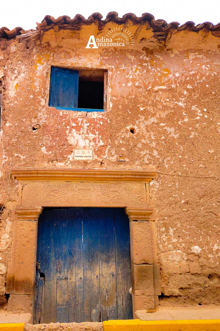 PORTADA JESUÍTA, denominada así por tener el anagrama jesuita JHS en su dintel, no indica que haya pertenecido a algún miembro de esta congregación. Su representación puede estar relacionado con hechos históricos del pasado, la llegada de los Jesuitas al Perú (1568) y la explotación agrícola en haciendas Marasinas por el colegio de la Compañía de Jesús en Cusco en 1689.