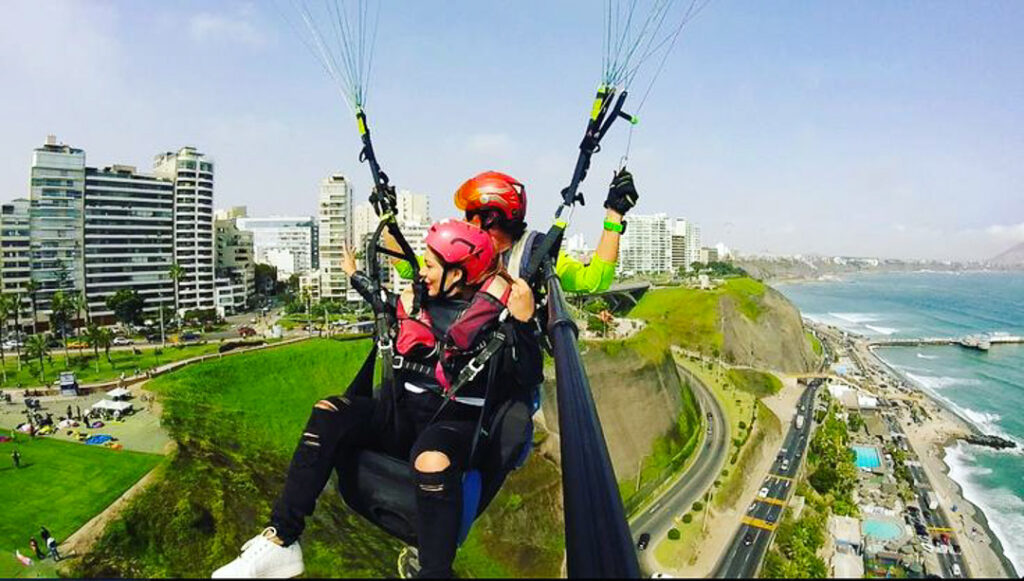 Una vez aterricen en el aeropuerto de Lima, los recibirá su host de Andina Amazonica quien los llevará al muelle de Miraflores donde su instructor lo estará esperando para darle una charla de seguridad para su excursión en el parapente biplaza. Luego de usar el equipo de seguridad y los consejos del instructor, usted dará un salto en compañía de su instructor sobrevolando el litoral costero, disfrutando las vistas espectaculares sobre el océano pacífico y sobre el distrito de Miraflores que cuenta con sus zonas verdes, parques, surfistas disfrutando de las aguas, edificios modernos y barrios atractivos, esta actividad tiene una duración aproximada de 40 minutos a una hora, dependiendo de las condiciones atmosféricas del día.